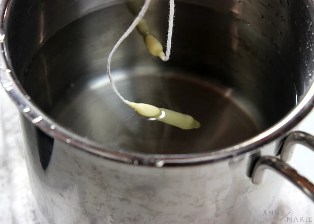 Beeswax is often used for hand-dipped tapers because it is a slow burning wax and the layers go on thicker, resulting in less dipping required to get a thick candle. You’ll also want a thicker wick. If you choose to use paraffin, you’ll want wax with medium or high melting points. Just melt the wax and dip! Melting the wax is the longest part of the process, but after that, it is pretty quick.
